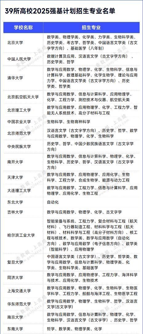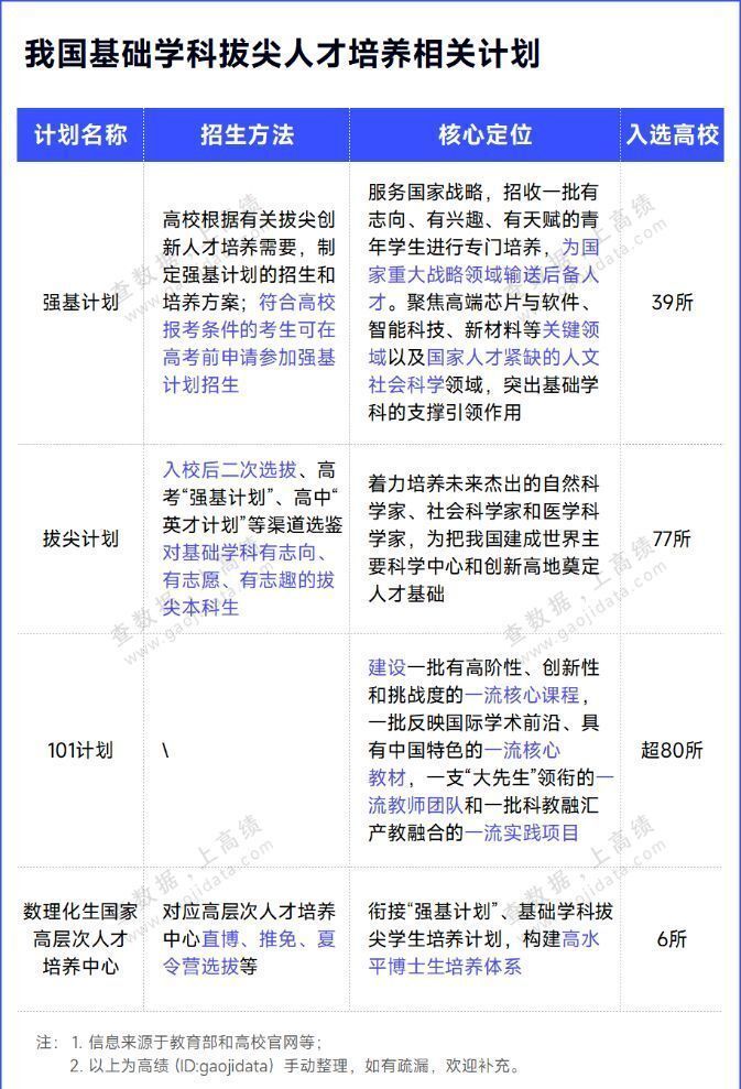 除了“强基计划”,我国还有多个旨在培养基础学科人才的计划。值此高校招生之际,高绩汇总了强基计划、拔尖计划、101计划、数理化生国家高层次人才培养中心等高校获批和入选情况。入选高校在基础学科建设方面,无疑具有顶尖实力,同时还肩负着服务国家战略需求、培养解决“卡脖子”问题的重大使命。